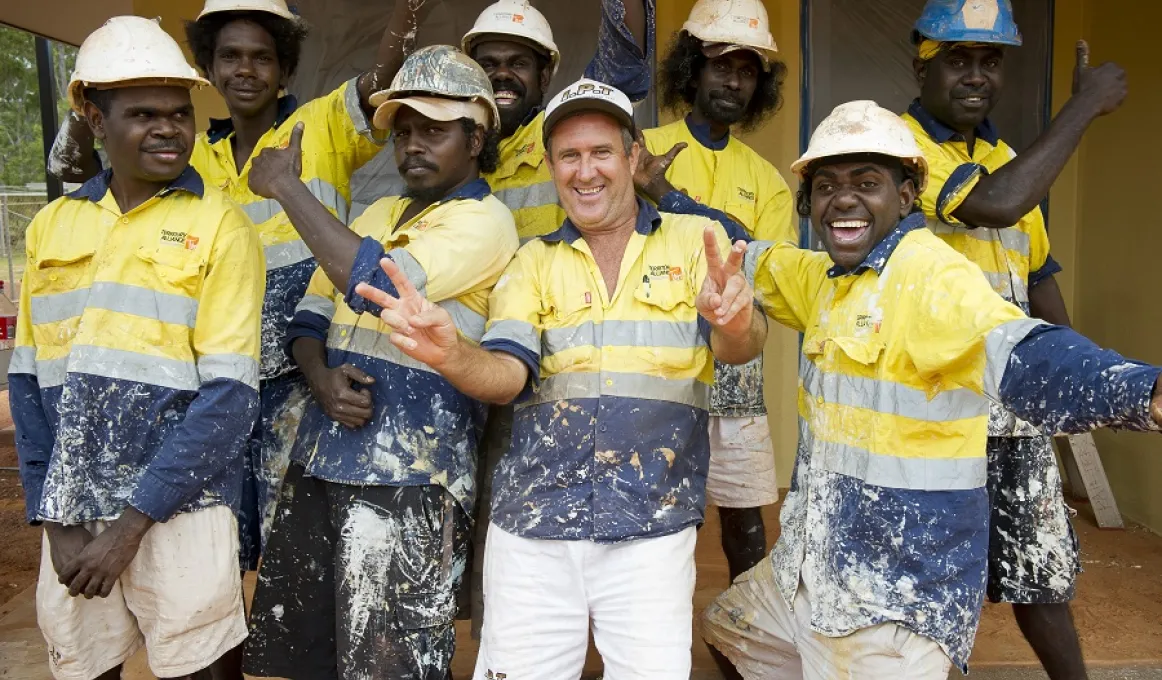 The enthusiastic Indigenous Painting Team in Galiwin’ku, Arnhem Land, awake early each morning and put on their brightly coloured uniforms, eager to continue their work painting houses in the community’s new housing subdivision.