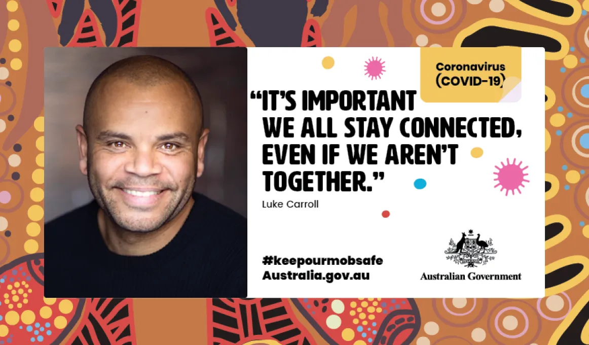 Image of Indigenous man at left with a notice at right: it's important we all stay connected even if we aren't together.' In the background are Indigenous designs.